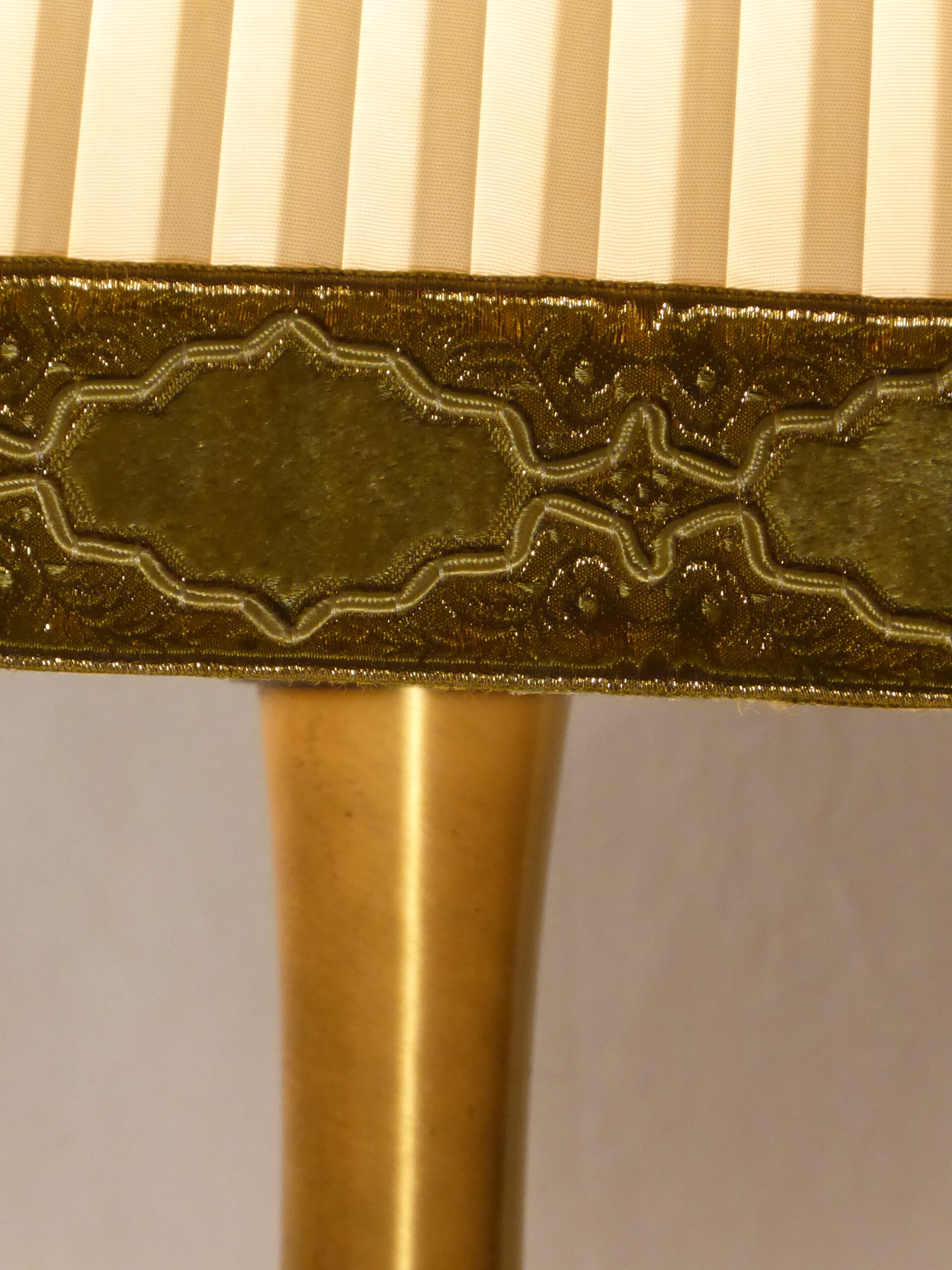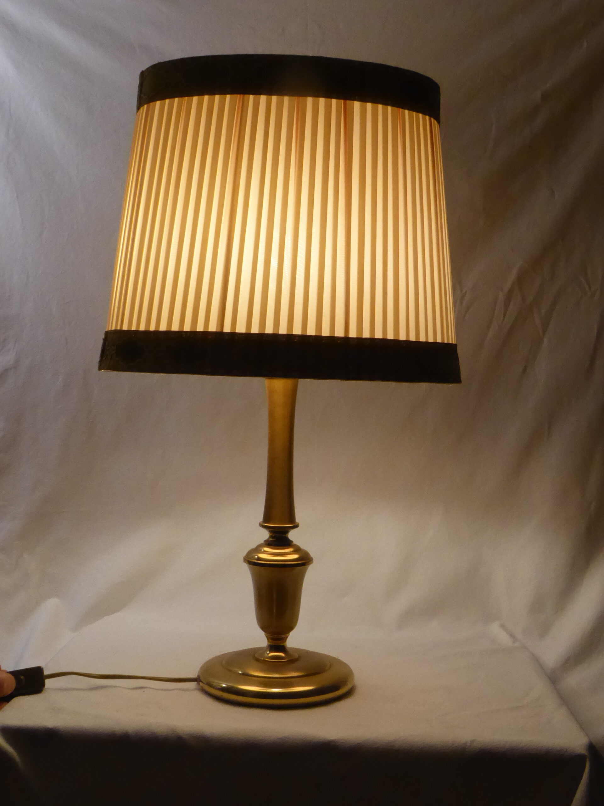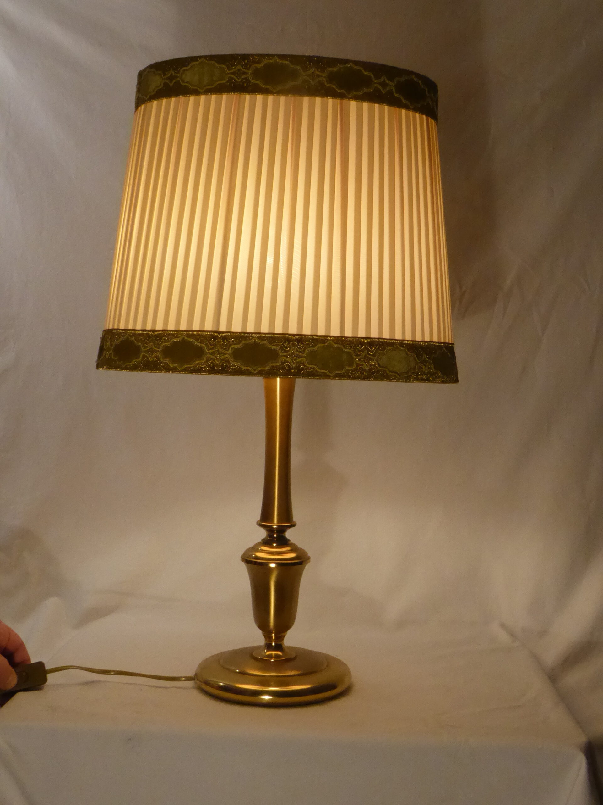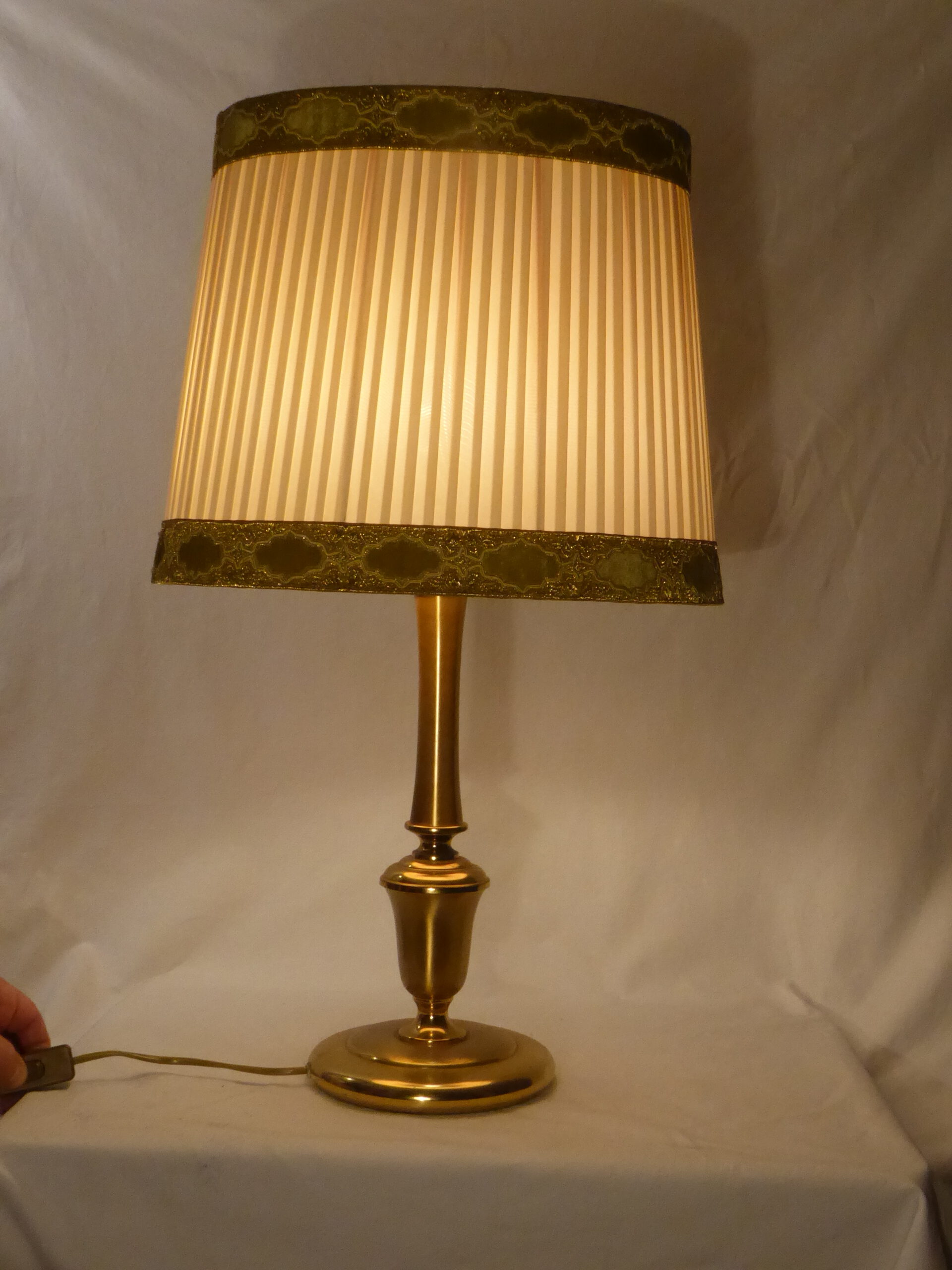 Artikelnummer:L0071LeuchtenttypTischleuchteName:Hersteller:Beschreibung:Tischleuchte Tischleuchte Messingfuß Faltenschirm mit BordeEpoche:Farbe:Messing BraunMaterial:Messing StoffFassung:E 27max. Leistung:40 WattGröße:Bestand:1