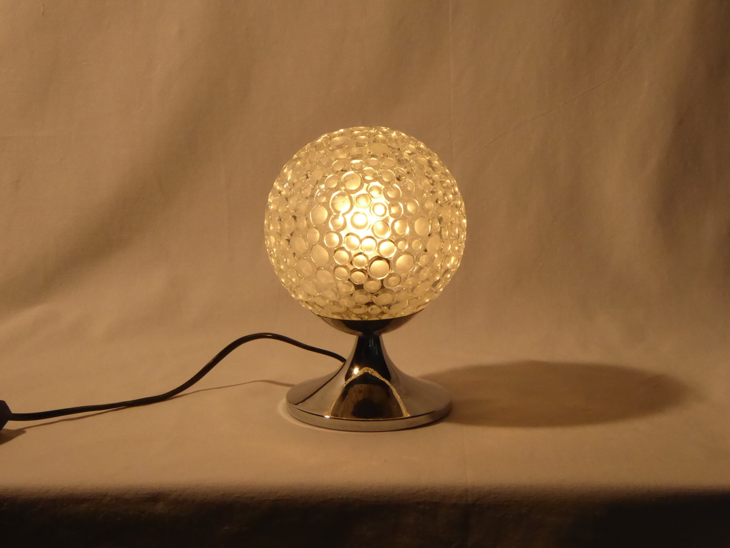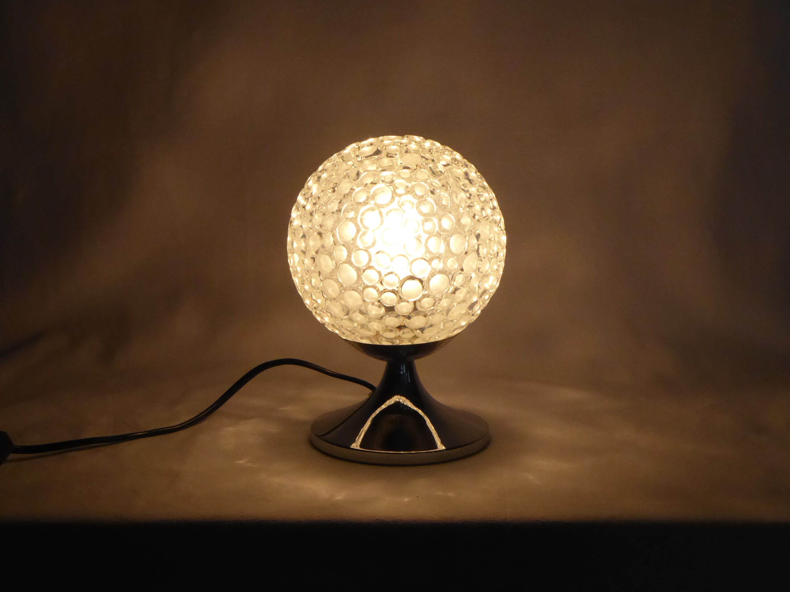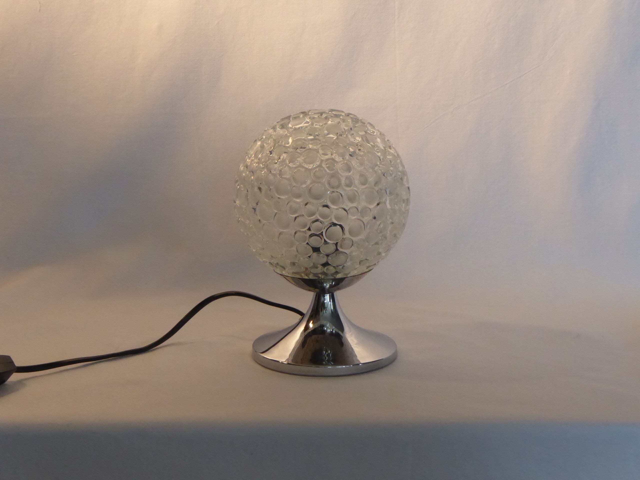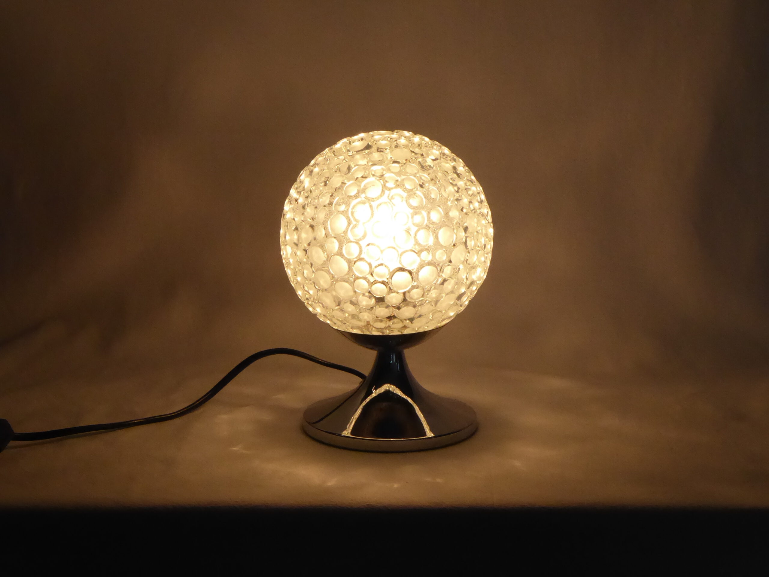 Artikelnummer:L0083LeuchtenttypTischleuchteName:Hersteller:Beschreibung:Glaskugel auf ChromfußEpoche:1970erFarbe:Glas ChromMaterial:Glas MetalFassung:E 14max. Leistung:40 WattGröße:Bestand:1